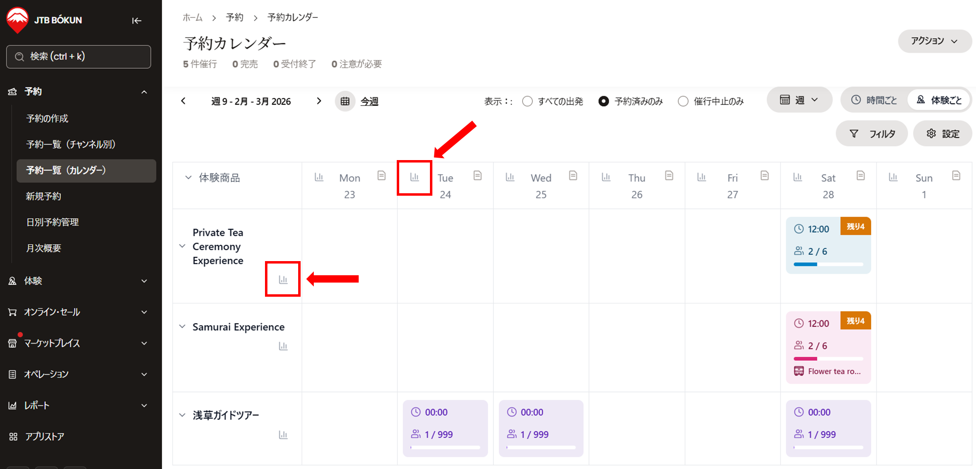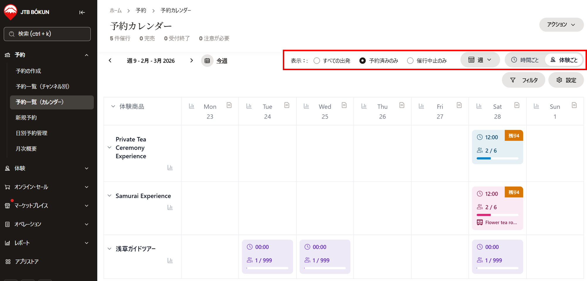 予約一覧(カレンダー)画面は、体験商品の予約状況をカレンダー形式で一目で確認できる便利な機能です。柔軟な表示設定と詳細な分析が可能になり、予約管理がよりスムーズになりました。