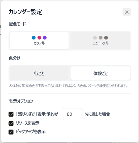 これらの設定を組み合わせることで、完売、残りわずか、閉鎖などの予約状況をより素早く、正確に確認できるようになり、オペレーション業務や予約管理の効率が大幅に向上します。