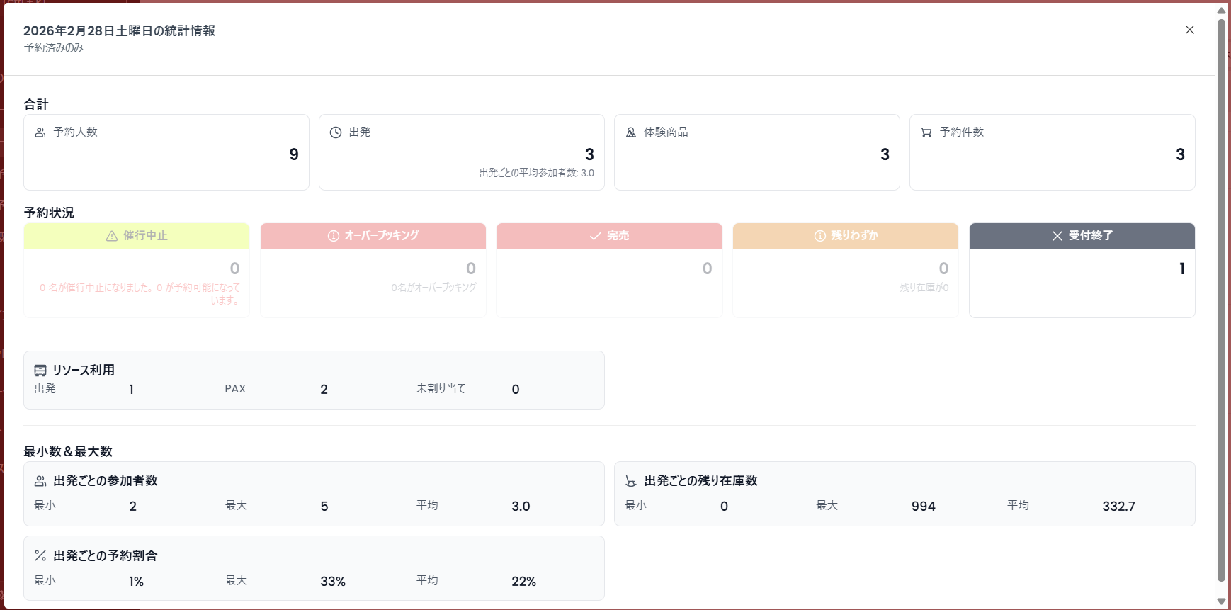 カレンダーの表示方法に応じて、様々な観点から予約状況の統計情報を確認できます。これらの統計情報は、今後の販売戦略やリソース配分の最適化に役立ちます。