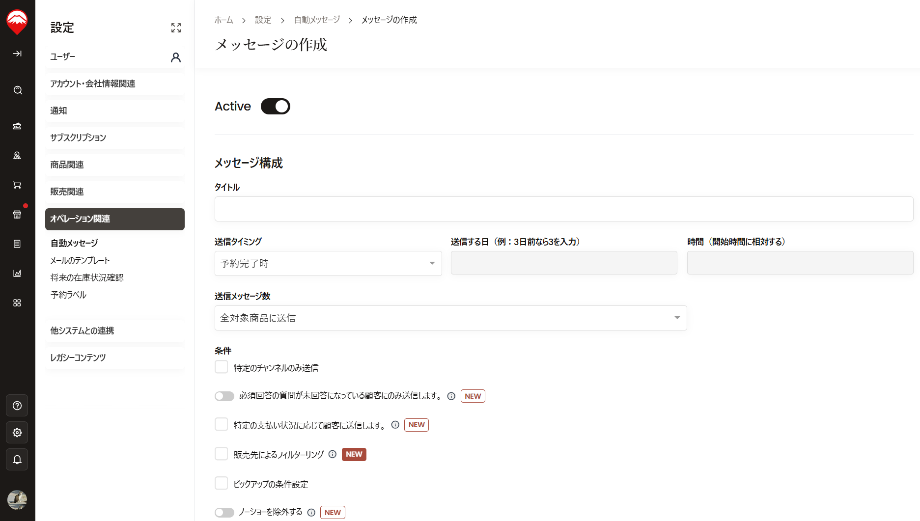 2.「メッセージの作成」をクリックします。新規の自動メッセージ作成画面は以下のようになっています。