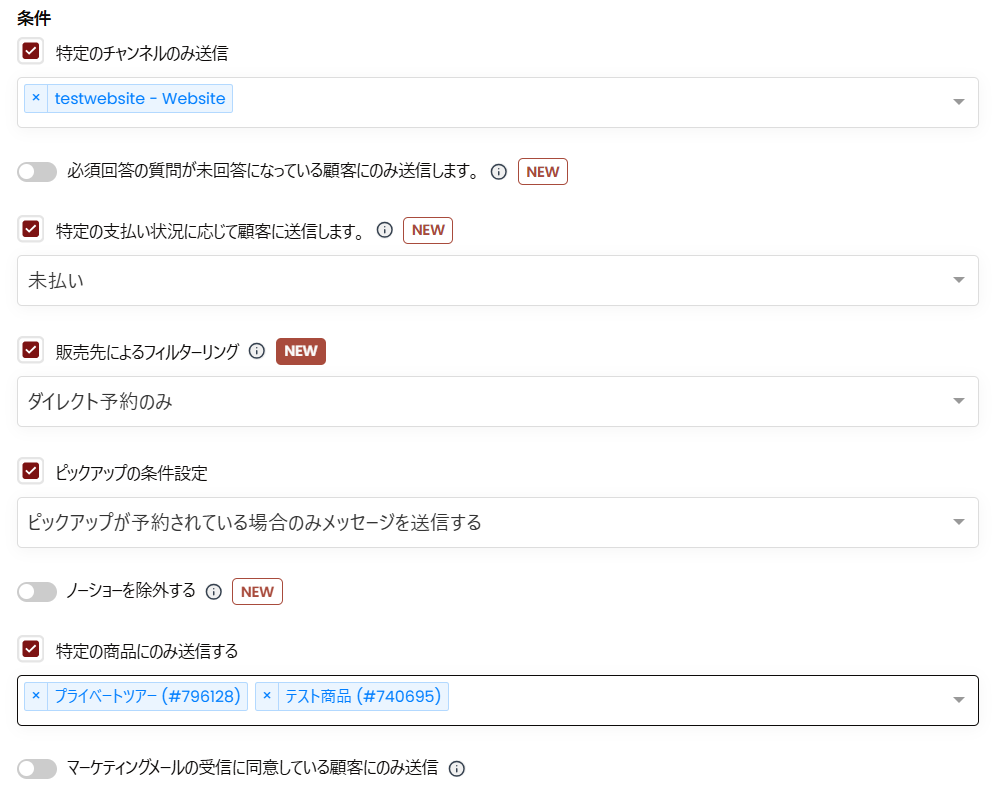- 特定の商品にのみ送信:ある特定の商品を予約した旅行者にのみ送ります。複数の商品を選択することができます。