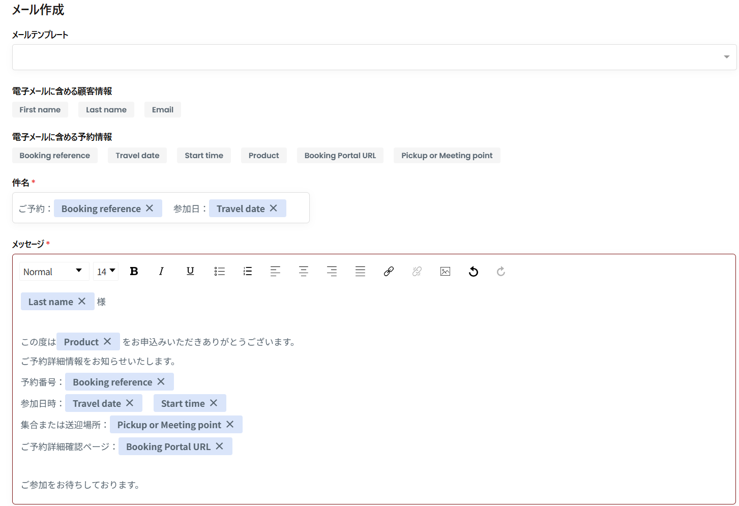 メッセージ:メール本文はこちらにご入力ください。下記の項目をクリックすると、件名や本文に自動で差し込まれ、メール内容に反映されます。