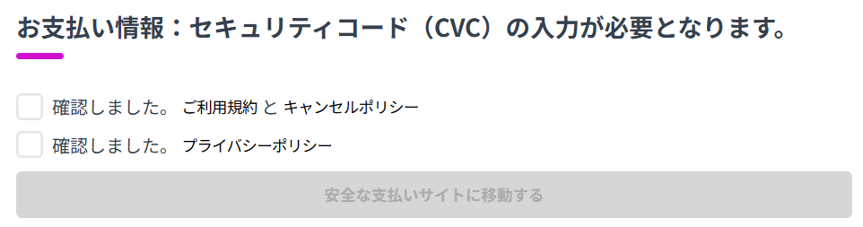 また、上記変更により、ウィジェット支払い確認画面に表示されるご利用規約、キャンセルポリシーとプライバシーポリシーのリンクテキストの色が下記のように黒色に変わります。