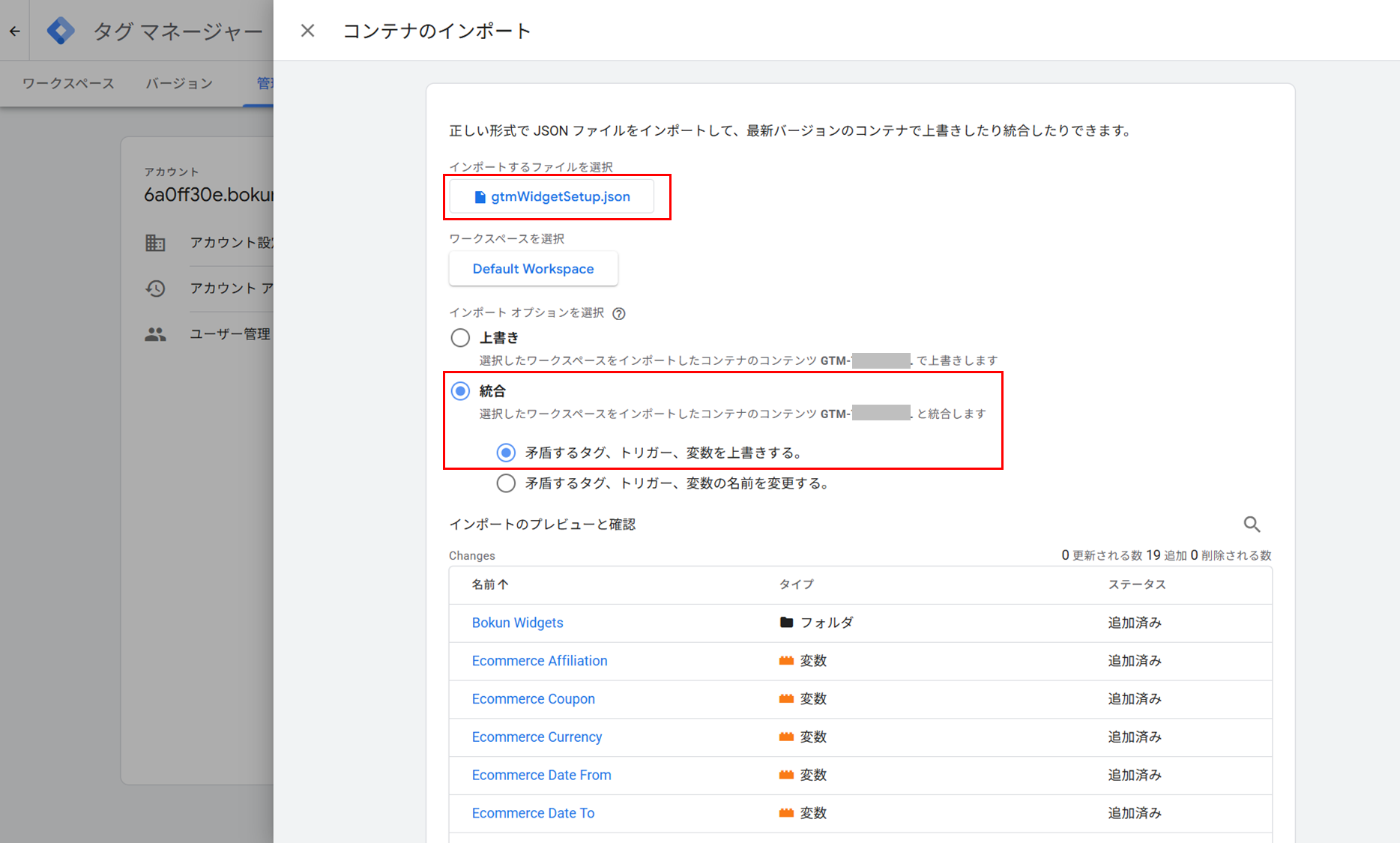 8.「インポートオプションを選択」では、「統合」>「矛盾するタグ、トリガー、変数を上書きする」を選択します。