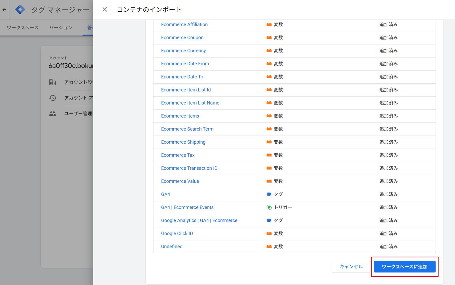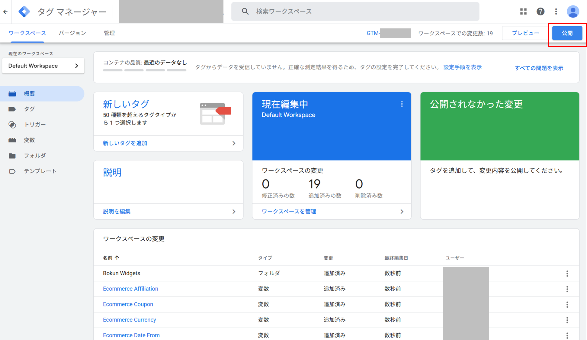 5.タグマネージャーコンテナの以下の画面を開きます。