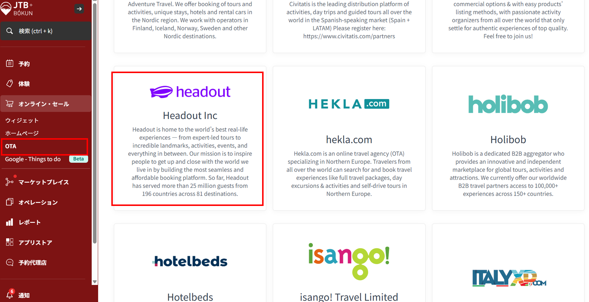 まず、JTB BÓKUN左側メインメニュー>オンライン・セール>OTAより、「Headout」をクリックし、Headoutとの接続案内ページにアクセスします。