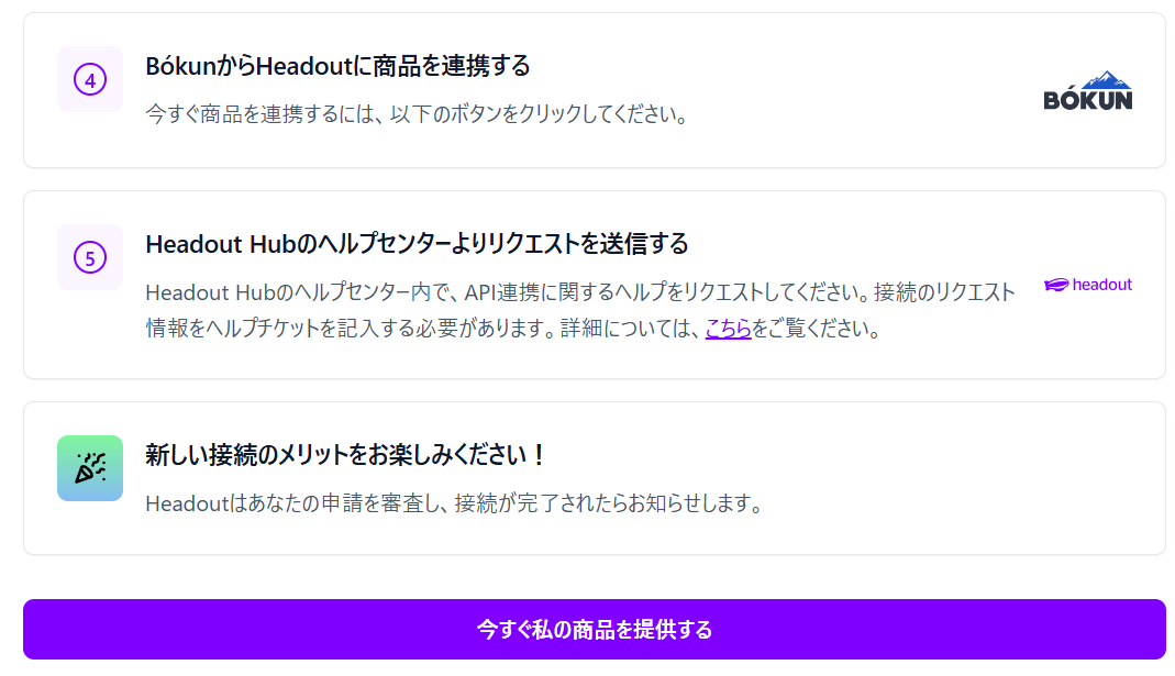 - 技術的にHeadoutがAPI経由であなたの商品にアクセスできるようにする