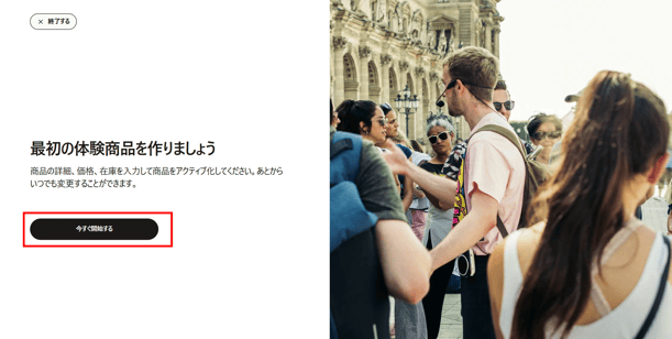 JTB BÓKUNで初めて体験商品を作成される場合、下記の画面が表示され、「今すぐ開始する」をクリックします。