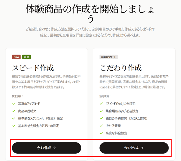 ここからは、「こだわり作成」を選択し、すべての入力項目が表示されていることを前提に、体験商品を作成する際に必要な各設定項目について、順を追って詳しくご説明します。