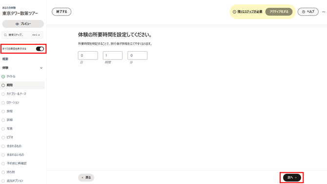 - 期間:体験/アクティビティの所要時間を設定して「次へ」をクリックします。この情報はウィジェット(予約画面)に表示されます。「期間」が表示されない場合は、「すべての項目を表示する」ボタンを切り替えてください。