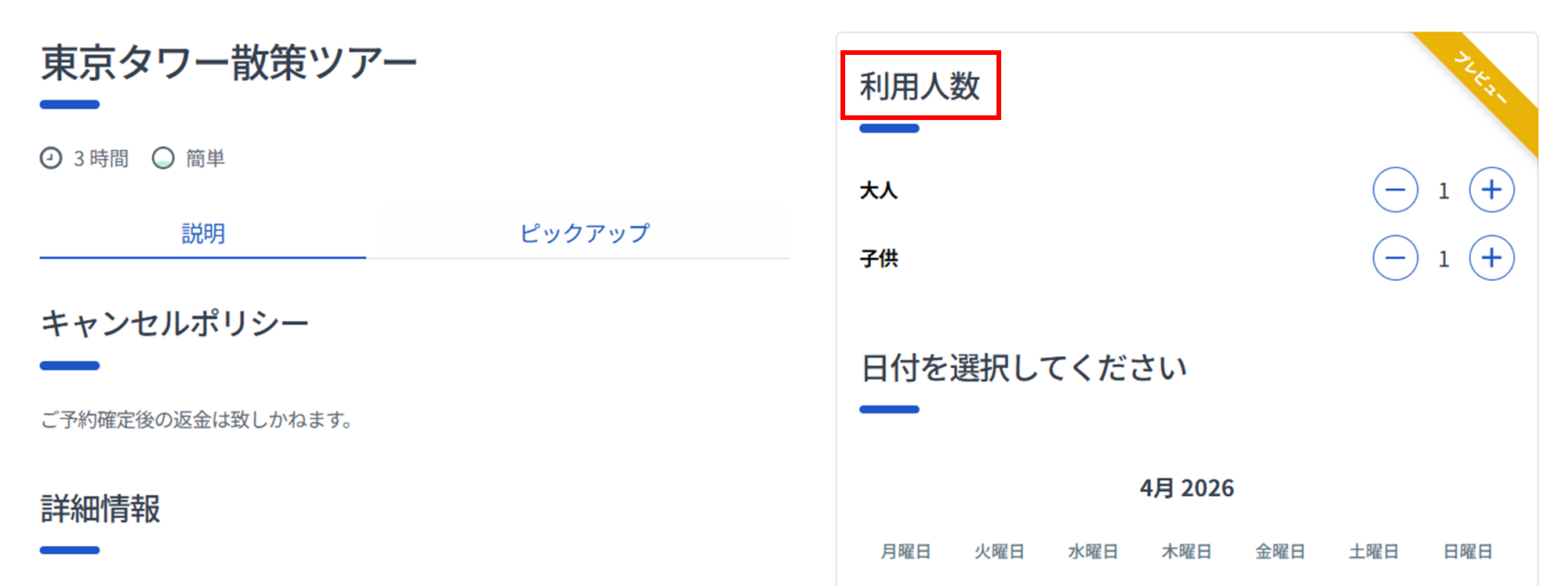 - 予約前に再確認:健康状態や年齢制限、バリアフリー対応の可否など、参加者が事前に知っておくべき情報を網羅してください。設定方法はこちらをご参照ください。