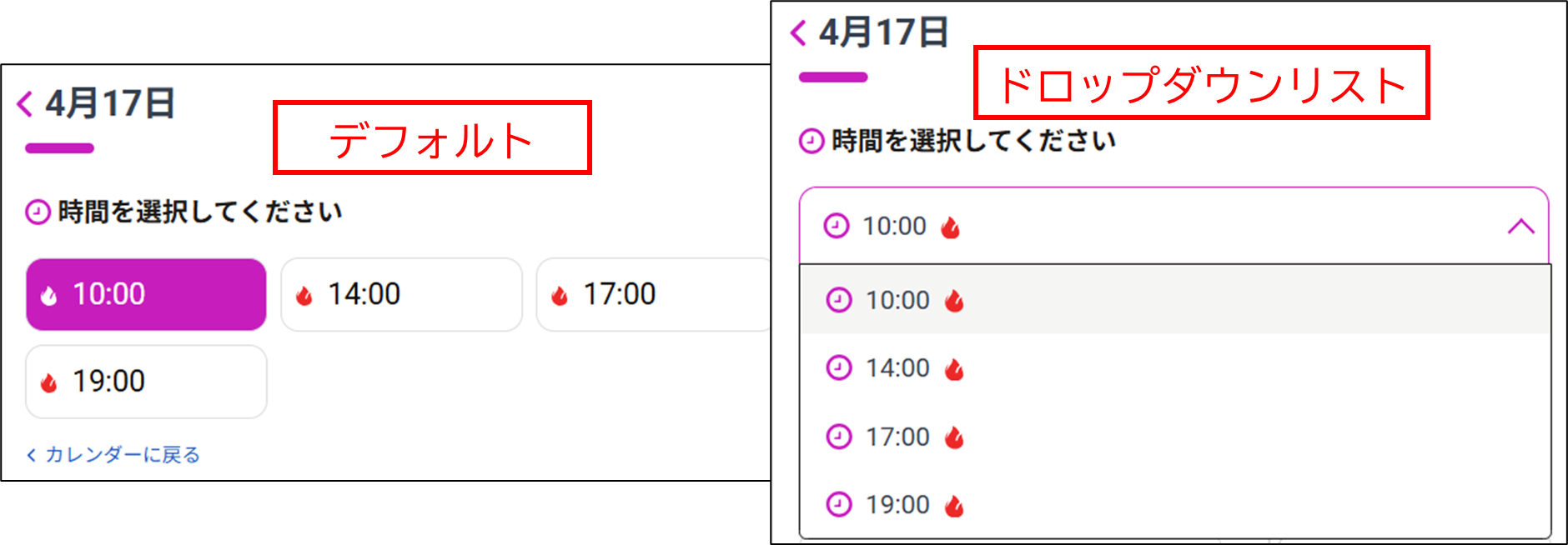 - ドロップダウンでの開始時間の選択:デフォルトでは、開始時刻はボタンとして表示されます。開始時間が多い場合は、ドロップダウンリストに変更することができます。