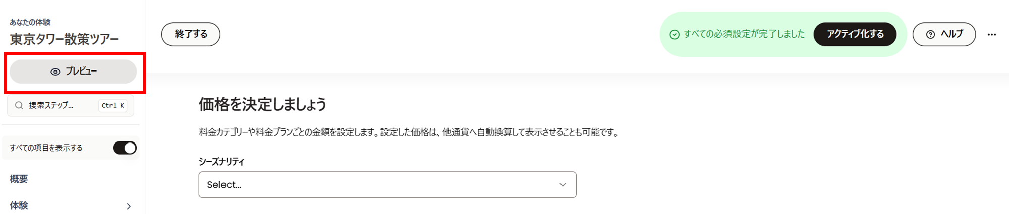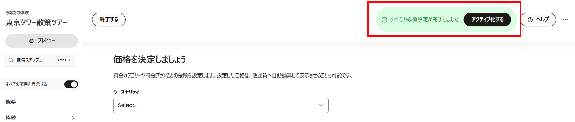 以上で、体験商品の主な設定項目の説明は完了です。必要な項目の設定がすべて完了すると、画面右上に「すべての必須設定が完了しました」というメッセージが表示されますので、「アクティブ化する」をクリックして商品を有効化してください。
