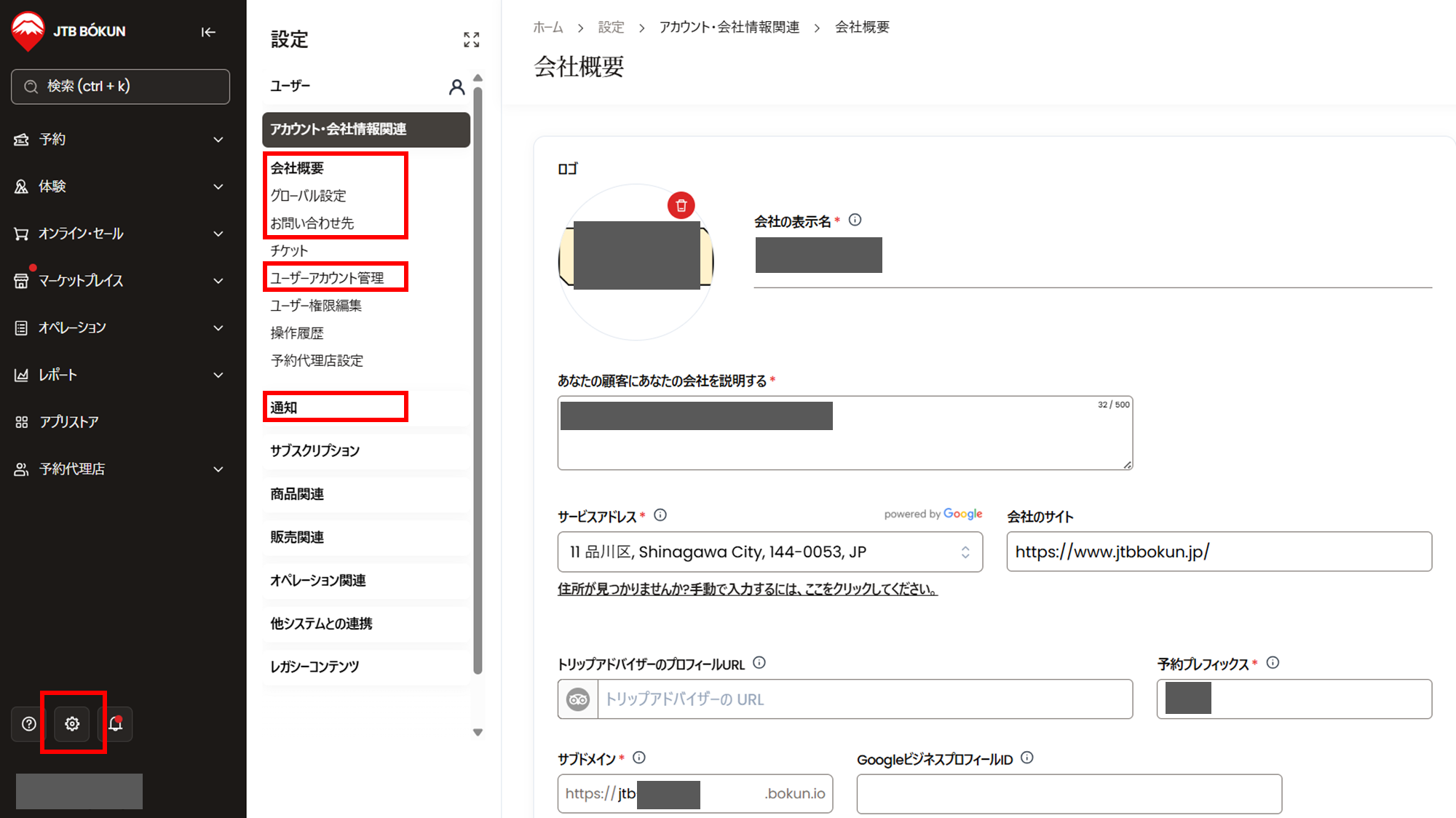 各種初期設定は、JTB BÓKUN管理画面左下の「設定/⚙」より行います。